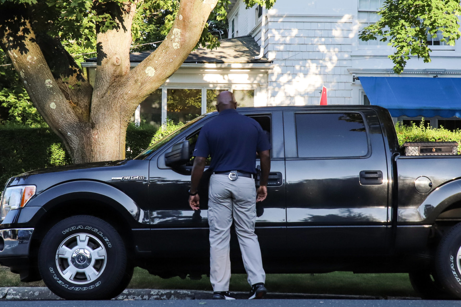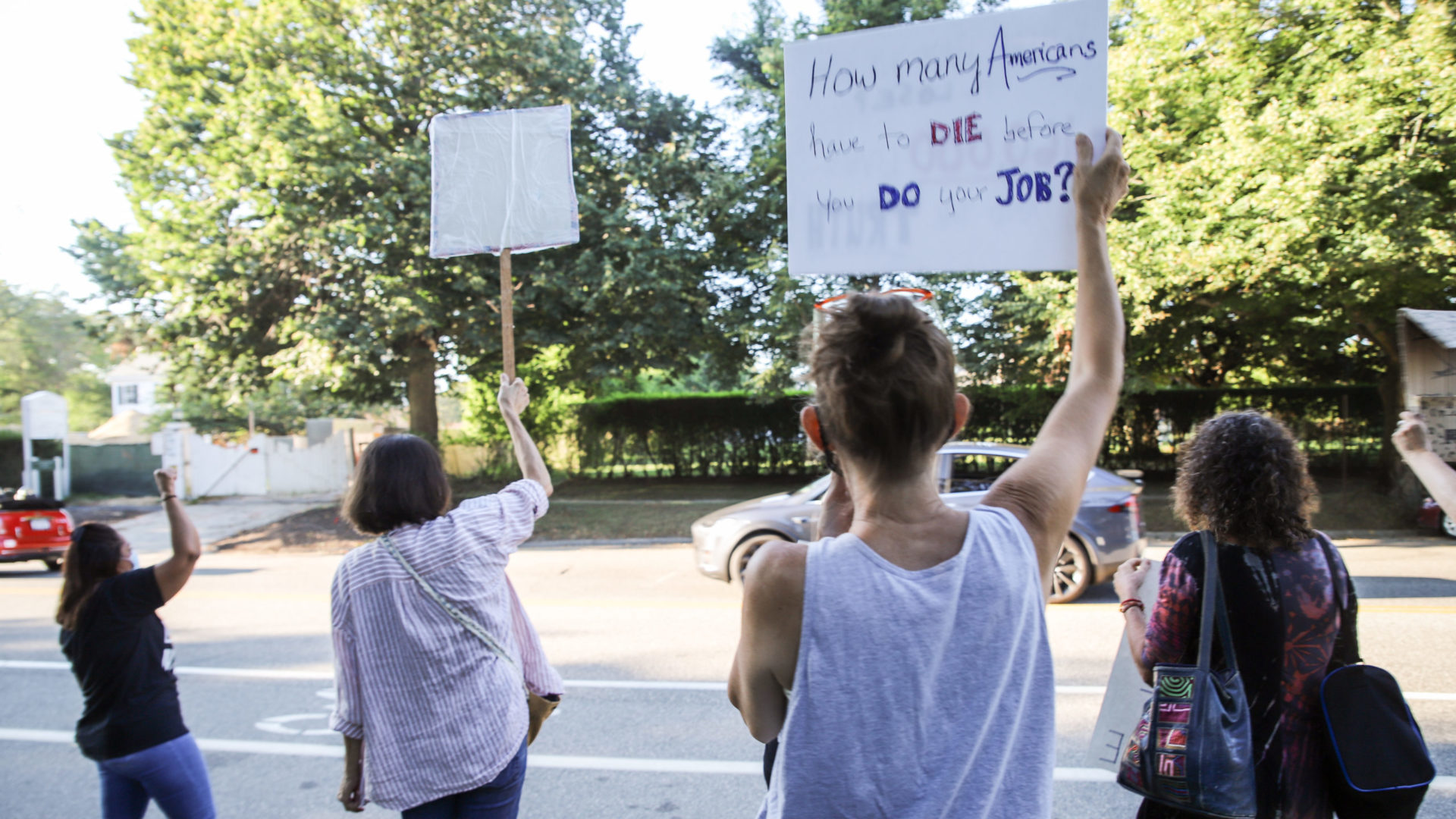Trump’s motorcade did not pass the group, which stood at the corner of Hill Street and First Neck Lane in Southampton Village, due to police road blocks. State troopers, Suffolk police and Southampton Town and Village police shut streets down for blocks around the high school and the location of the fundraiser, John Paulson’s house on First Neck Lane.
