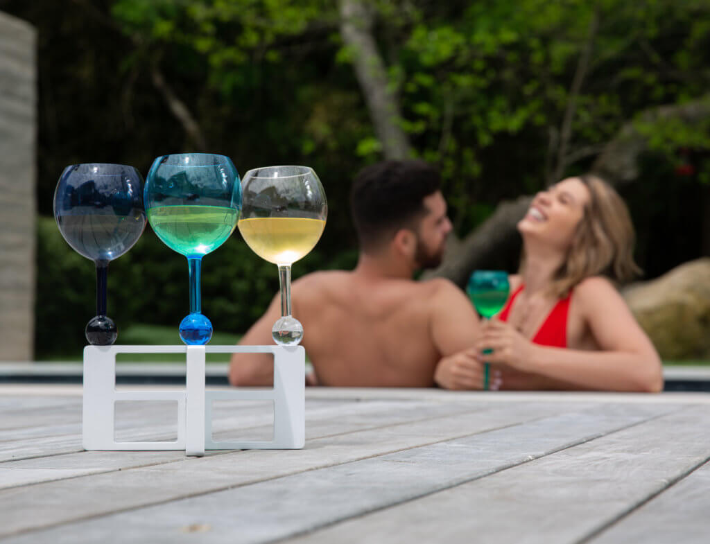 The product has also evolved a bit over time. To meet the demand for other beverages, they created the Caribbean Beach Glass for beer, margaritas, mojitos and even for children’s water and soft drinks. With a sleek, modern shape, it offers a rocks glass atop the same stem. The colors really pique one’s longing for a coastal vacation: Indigo Skies, Cerulean Seas, Jasmine Coast, Mint Mojito, Seashell White, Bonfire Orange and Coral Pink.