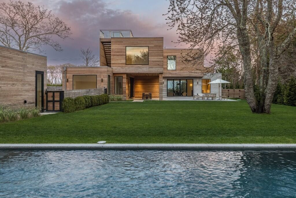 Designed by Studio Zung, this 5,080-square-foot home combines the luxurious Hamptons beach aesthetic with a more modern style. The exterior consists of Garpa wood panels and Polycor Limestone, the same stone used to build the historic Grand Central Terminal. These are just a few defining details of this six-bedroom home.